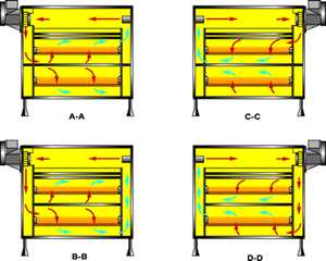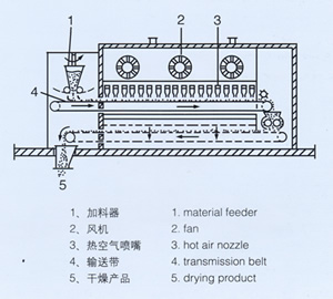 物料由加料器均匀地铺在网带上,网带一般采用12-60目不锈钢丝网,由传动装置拖动在干燥机内移动。干燥机由若干单元组成,每一单元热风独立循环,部分尾气由专门排湿风机排出,废气由调节阀控制,热气由下往上或由上往下穿过铺满物料的网带完成热量与质量传递的进程,带走物料水份。网带缓慢移动,运行速度可根据物料温度自由调节,干燥后的成品连续落入收料器中。上下循环单元根据用户需要可灵活配备,单元数量亦可根据需要选取。